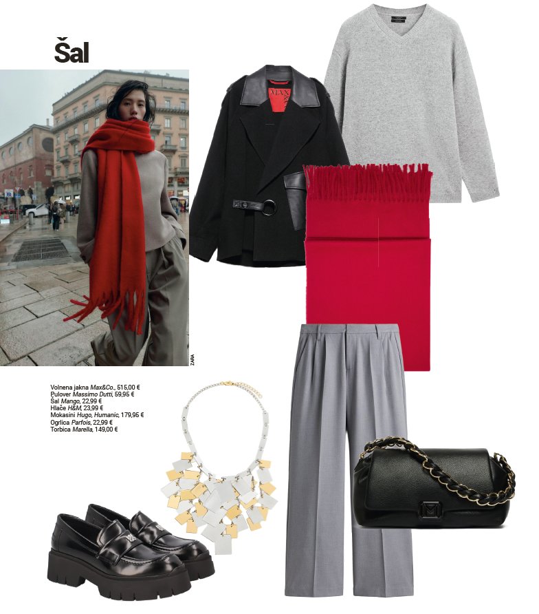 Modne kombinacije v nevtralni barvni paleti, ki jih dopolnjuje izrazita rdeča barva. Takšni kosi so enostavni za kombiniranje in primerni za vsak dan. Rdeča barva videzu doda svežino in energijo, nevtralni toni pa poskrbijo za uravnotežen in urejen videz. Kombinacije so primerne tako za službo kot za prosti čas.